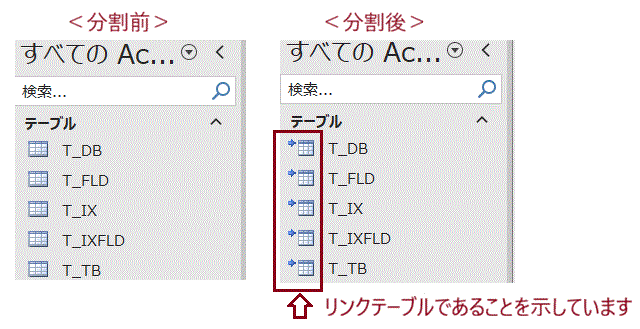 テーブルをフォームやレポートのオブジェクトから切り離したDBに移行し、ソースDBとはリンクテーブルとして連結するという機能です。リンク元のパスはソース側から自由に変更できますので、必要に応じてテーブルを切り替えて運用することができるのです。