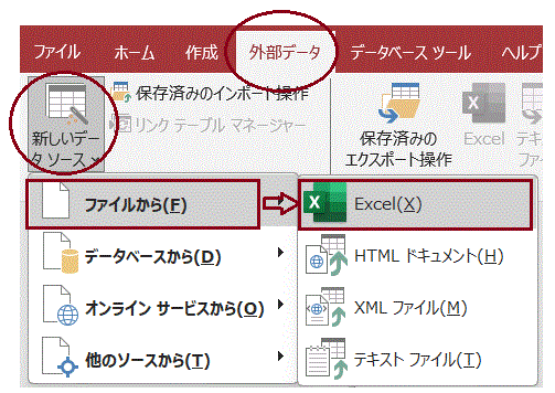 主メニューの「外部データ」から「新しいデータソース」を選択し、「Excel」を指定します。