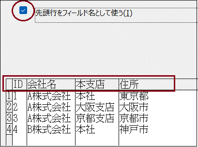 ②「先頭行をフィールド名として使う」にチェックをいれると、先頭行がそのままフィールド名になります