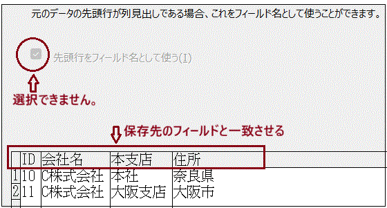 先頭行がフィールド名とみなされます。