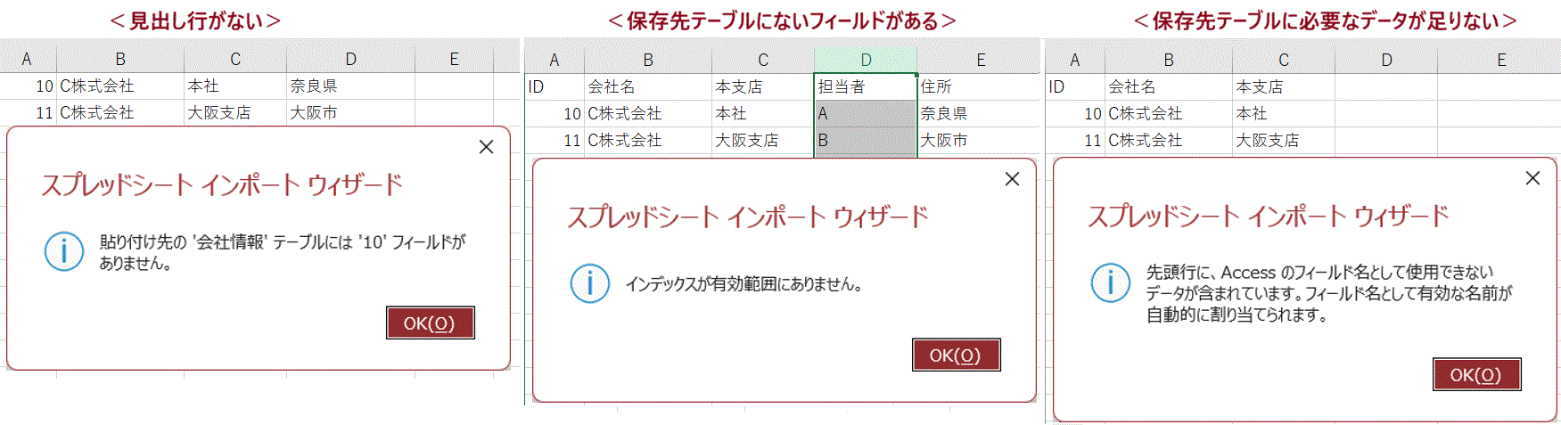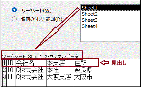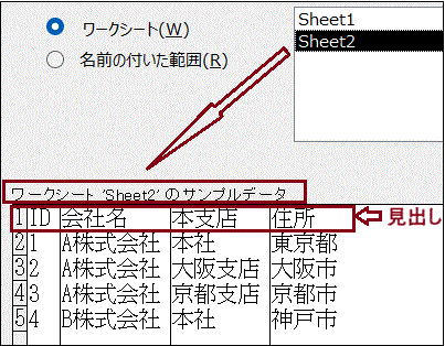 よって、見出し行は必ず必要です。また、追加するテーブルのフィールド名と一致させておく必要があります。