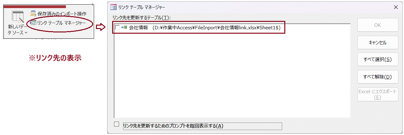 ⑥主メニューから「リンクテーブルマネジャー」を開くと、リンク先のアドレス、テーブル名を確認することができます。