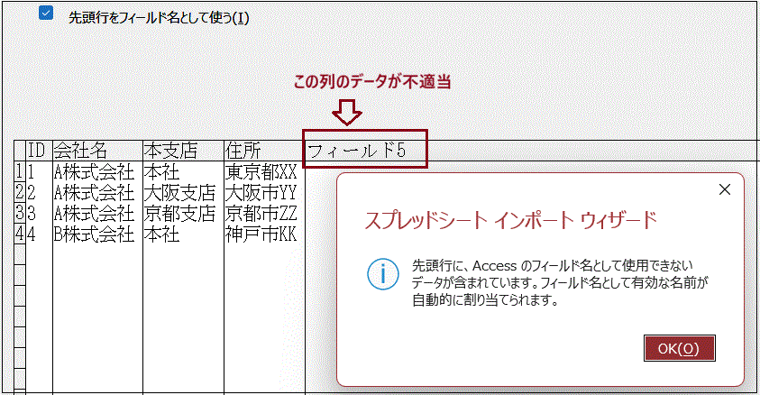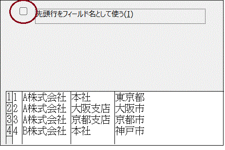 ②「先頭行をフィールド名として使う」チェックボックスに必要ならチェックを入れます。
