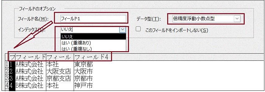 フィールド2フィールド名=会社名、データ型=短いテキスト、インデックス=なし