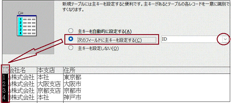 この例では「ID」を主キーと指定しましたので、フィールドから「ID」を選択しています。