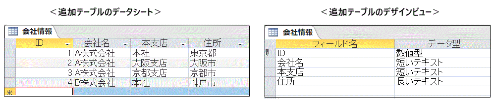 先に新規作成した、「会社情報」テーブルに、右のようなデータを追加するものとします。