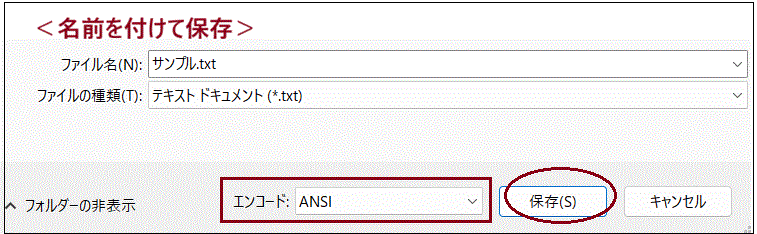 あるいは、メモ帳の場合は、メモ帳で開きなおし「名前を付けて保存」で「エンコード」を「ANSI」に変更して保存することでも解消できます。「ANSI」は「SHIFT_JIS」のことです。